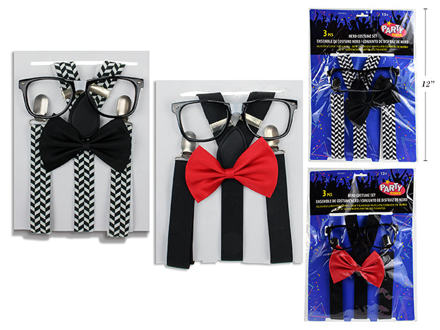 Set de disfraz de nerd que incluye tirantes, gafas y corbata de moño. Disponible en 2 estilos surtidos. Ideal para fiestas temáticas y disfraces divertidos.