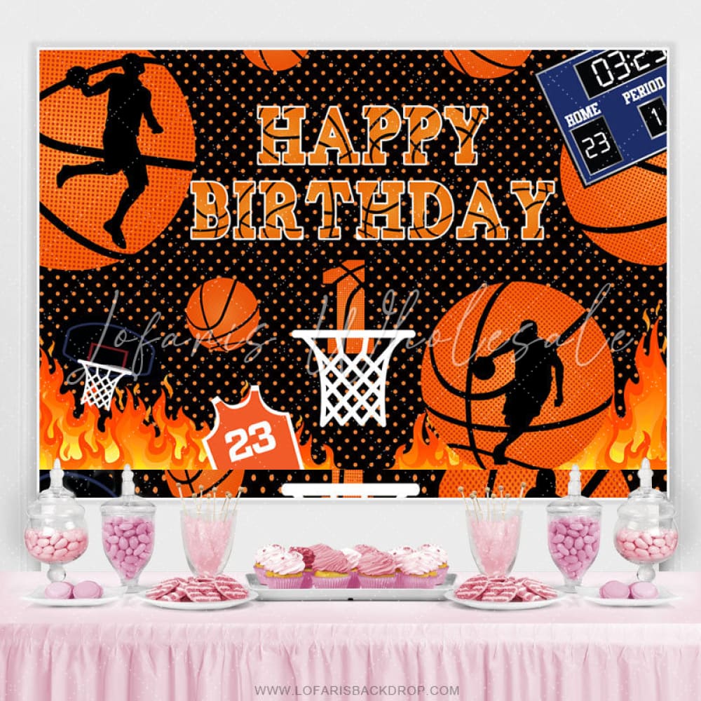 🎨 Diseño: balón de baloncesto en llamas, cancha y mensaje “Happy Birthday”