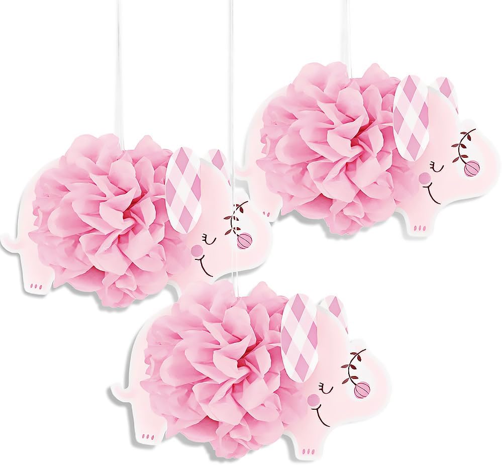 Decora tu fiesta con estos encantadores pompones de 9", perfectos para colgar y dar un toque tierno y festivo a tu celebración. Con un diseño de elefante rosa y detalles florales, son ideales para baby showers y fiestas infantiles.
