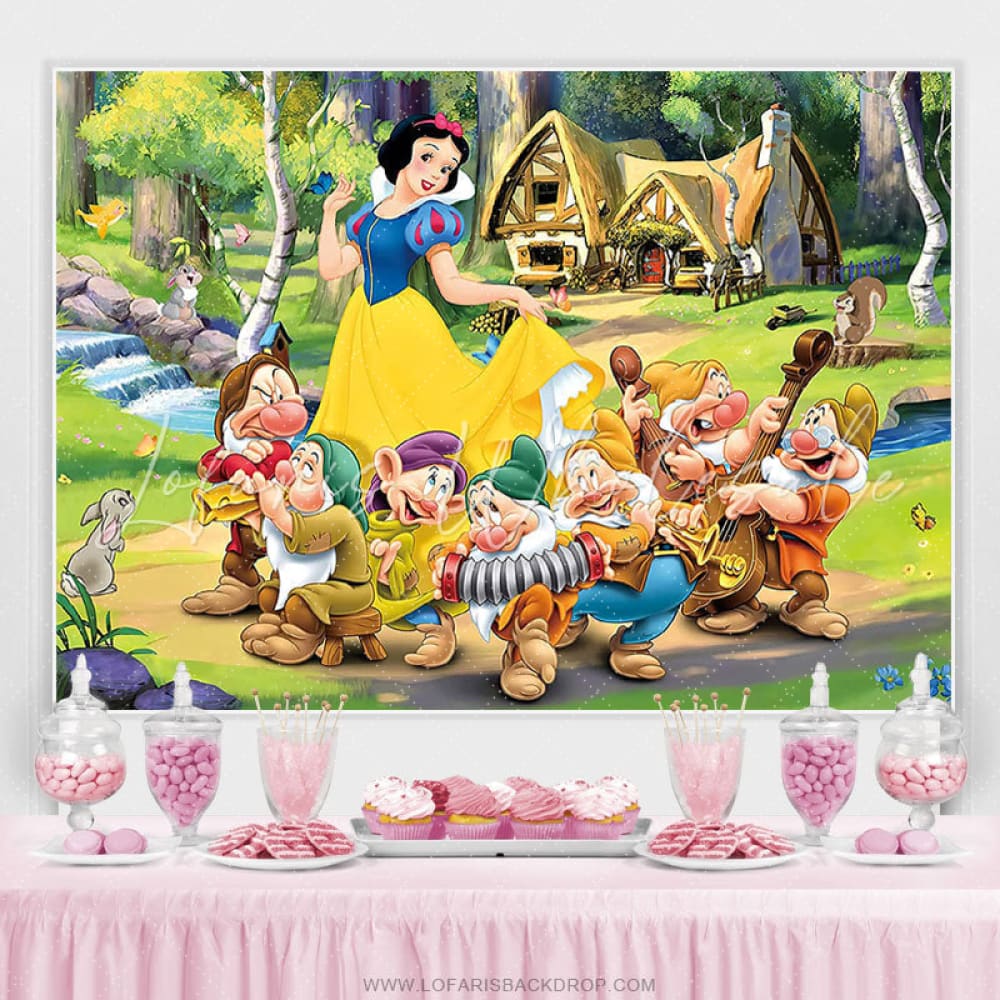 🎨 Diseño: Blancanieves junto a los siete enanitos en un paisaje de bosque encantado.