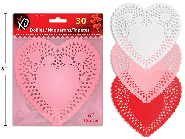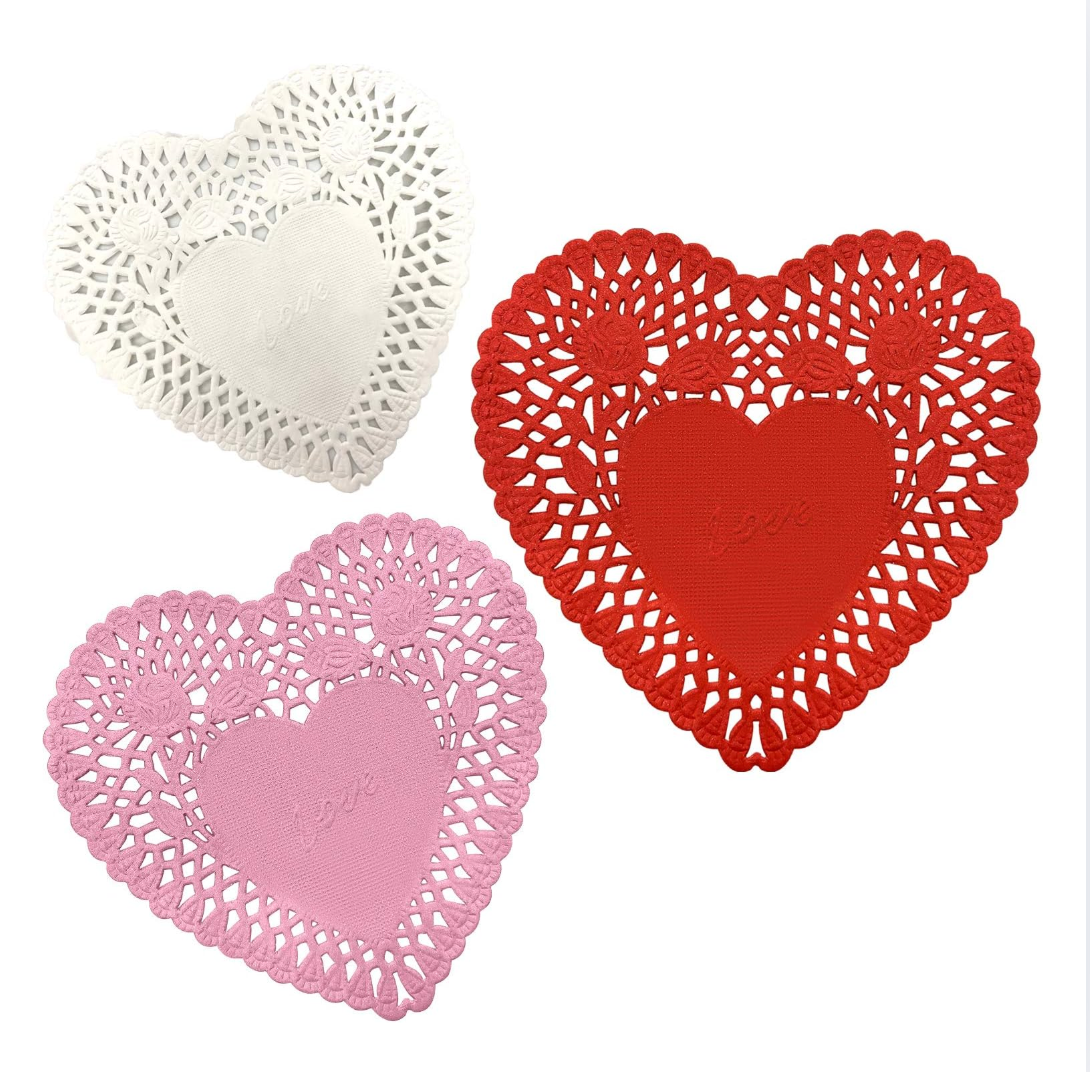 Paquete de 20 doilies en forma de corazón de 6 in, disponibles en 3 colores surtidos: rojo, rosa y blanco. Presentados en una bolsa de polipropileno con inserto, perfectos para decoraciones y manualidades de San Valentín.
