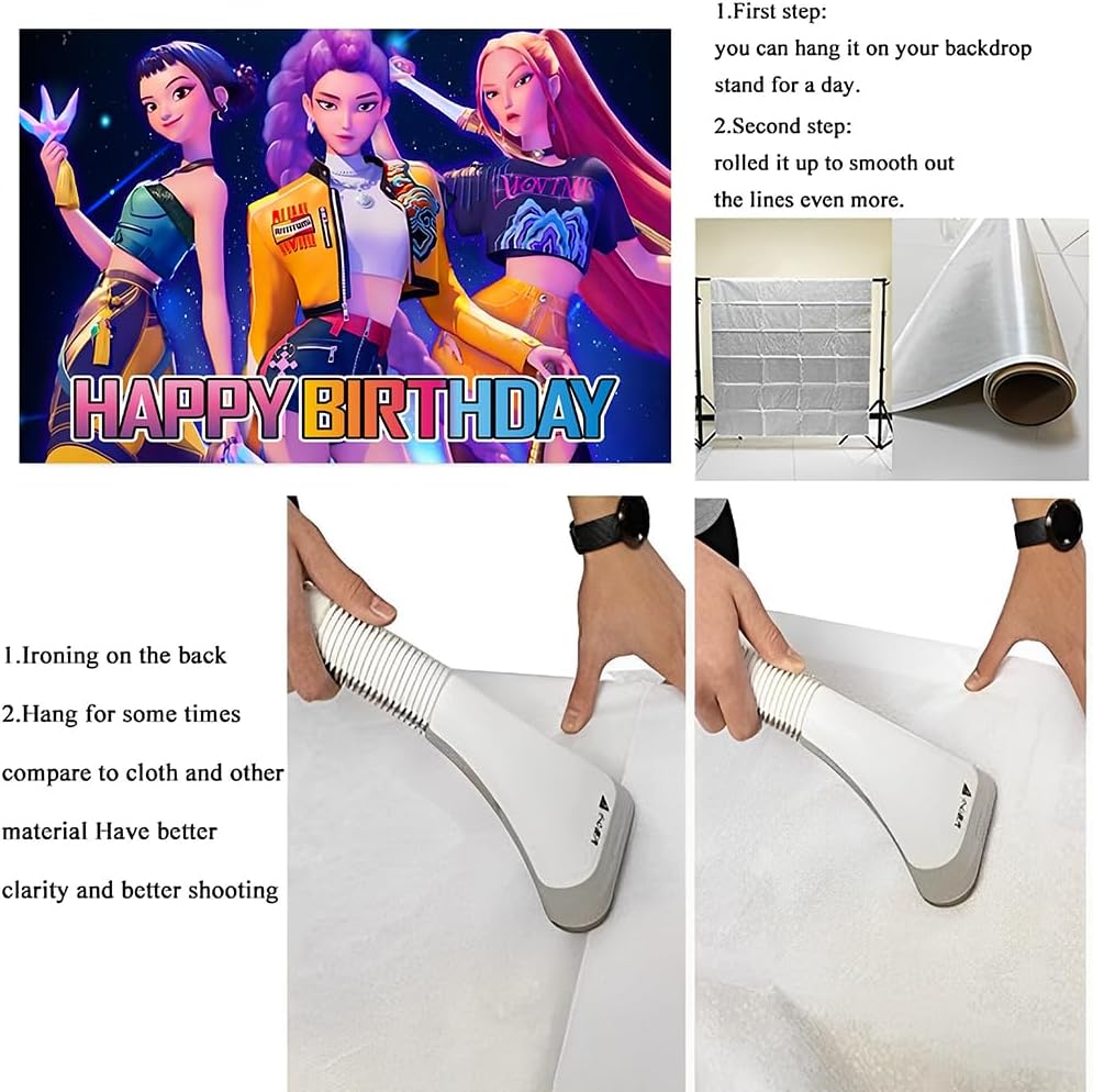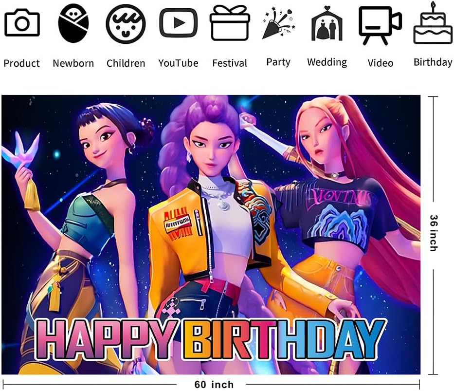 Crea el escenario perfecto para tus fotos o decoración de fiesta con este backdrop inspirado en K-Pop Demon Hunters. Ideal para fans, reuniones temáticas o sesiones de fotos épicas.