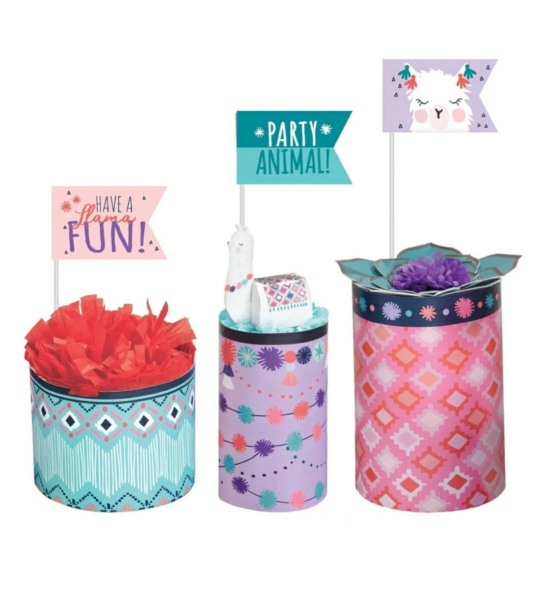 3 centros de mesa con figuras de llamas y decoraciones en tonos alegres