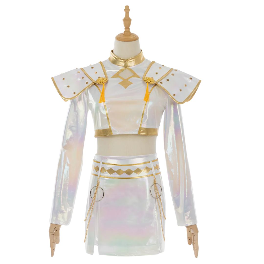 Destaca como un verdadero ídolo con este disfraz de Kpop Demon Hunters en color blanco con diseño de hombros descubiertos. Un look llamativo y moderno, ideal para quienes buscan un estilo único en fiestas o presentaciones.