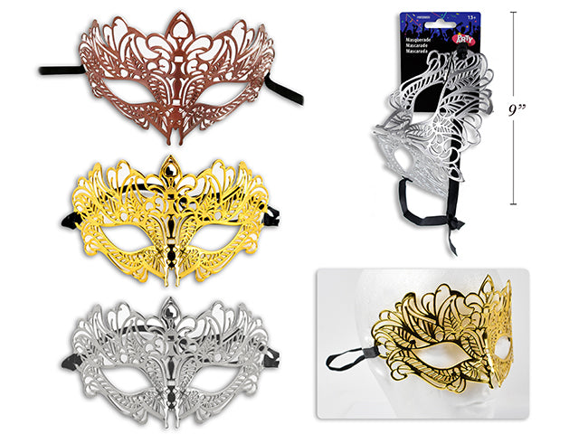 Añade un toque de misterio con esta elegante máscara de encaje de 7.5in x 4.5in. Disponible en tres colores brillantes: Plata, Oro Rosa y Dorado, perfecta para fiestas de Halloween o eventos de disfraces.