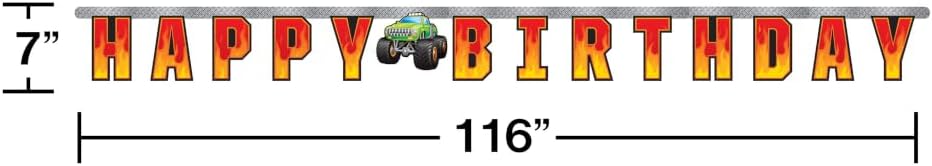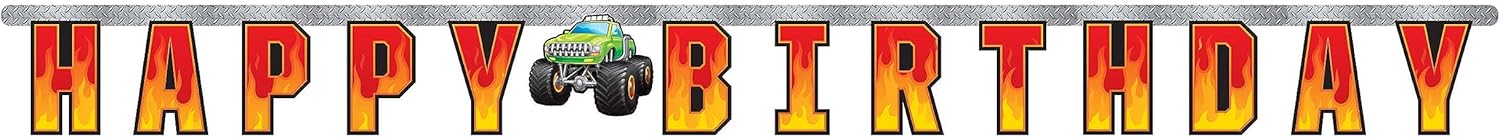 Banderín con la frase "Happy Birthday" en diseño de Monster Truck Rally. Colorido y llamativo, perfecto para darle energía y diversión a la decoración de cumpleaños temáticos.