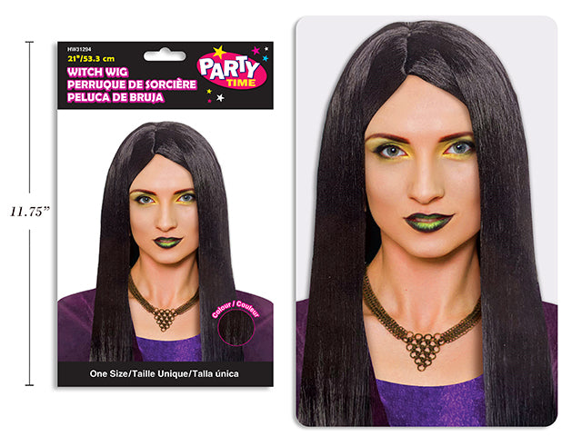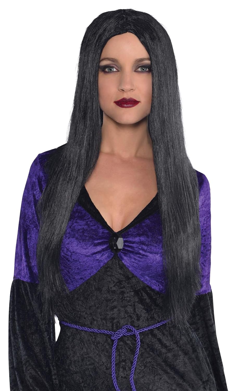 Completa tu disfraz con esta peluca negra deslumbrante, ideal para cualquier look de bruja o personaje oscuro. Con su largo de 21 pulgadas y acabado brillante, le dará a tu atuendo un toque misterioso y encantador.